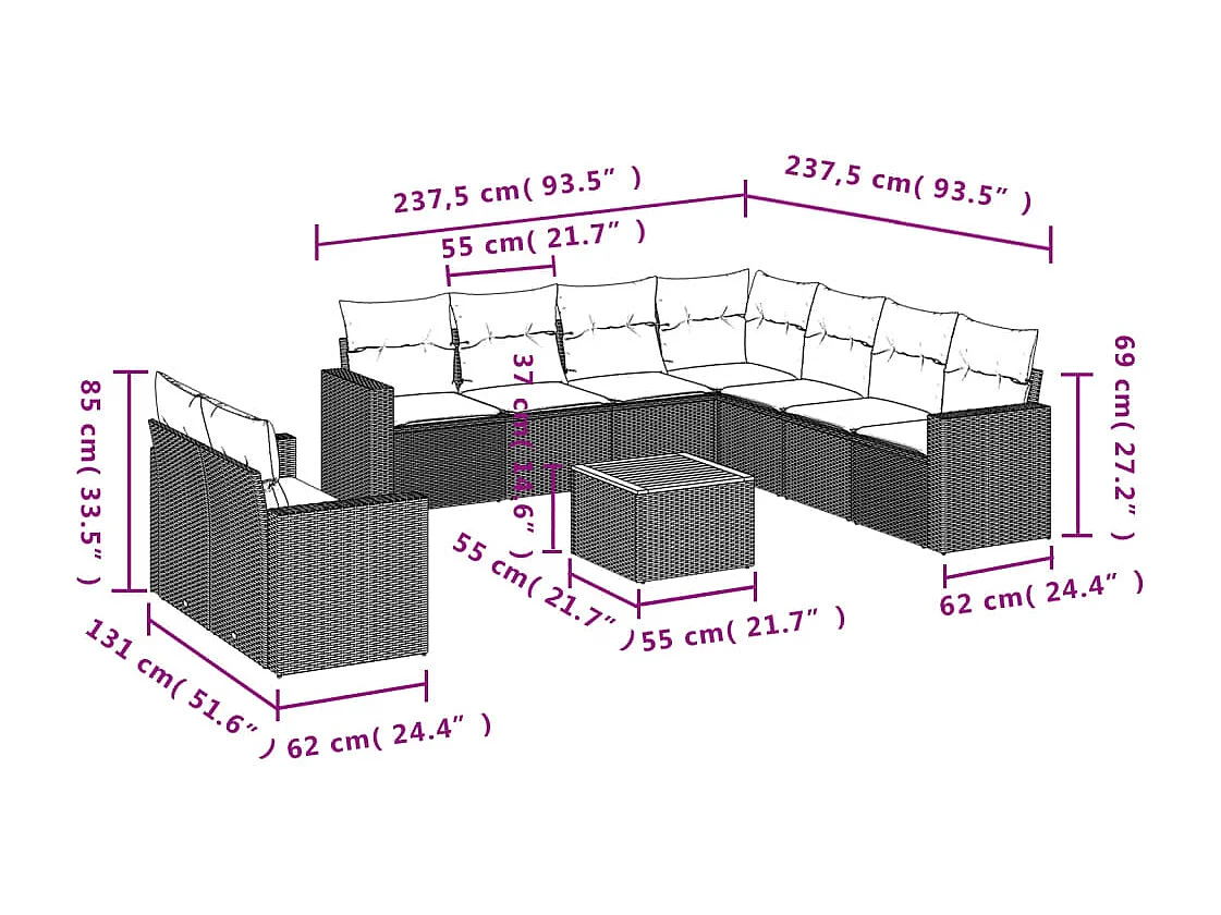 10 pcs conj. sofás jardim c/ almofadões vime PE bege misturado