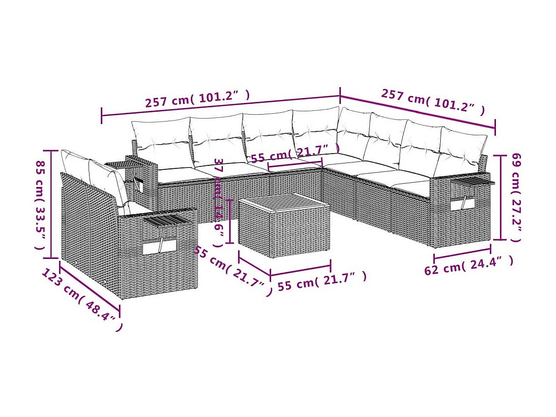 10 pcs conjunto de sofás p/ jardim com almofadões vime PE bege