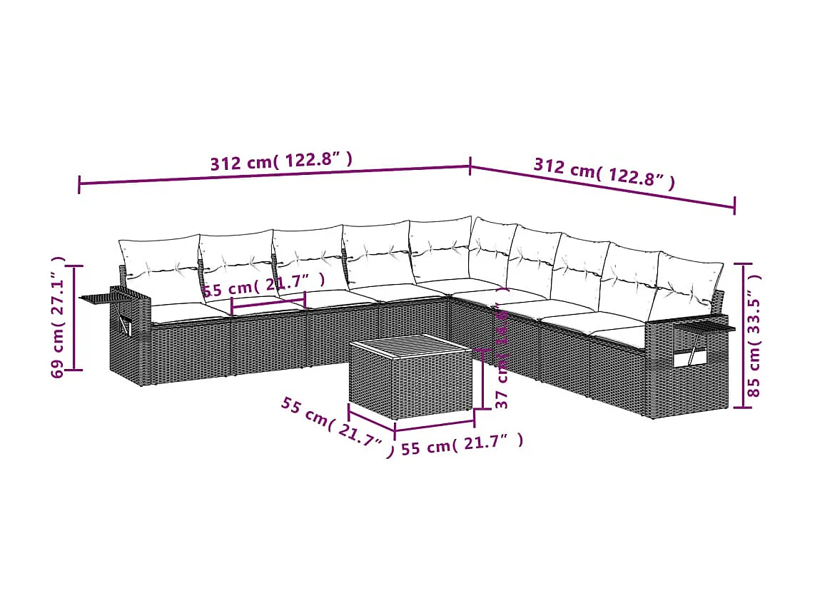 Móveis de jardim com almofadas 10 unidades de resina tecida cinza