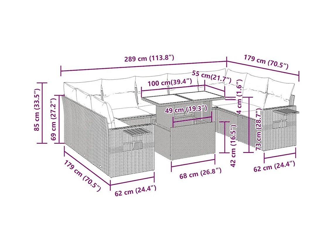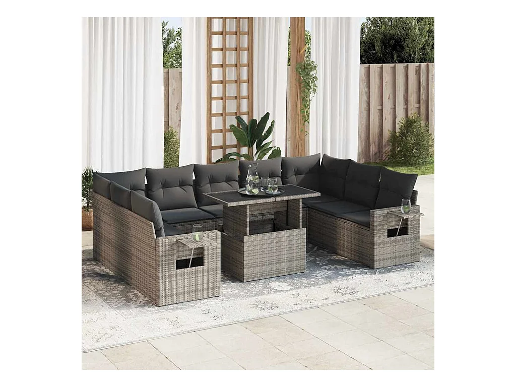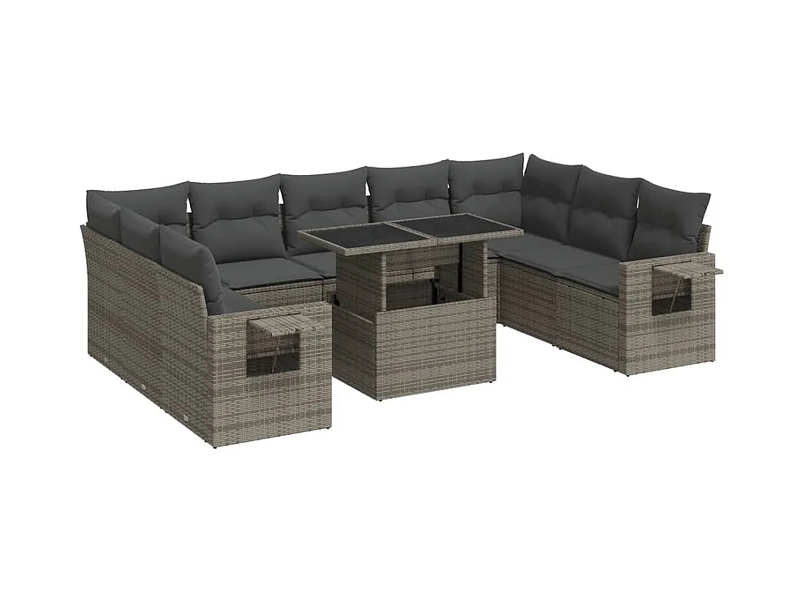 10 pcs conjunto sofás de jardim c/ almofadões vime PE cinzento