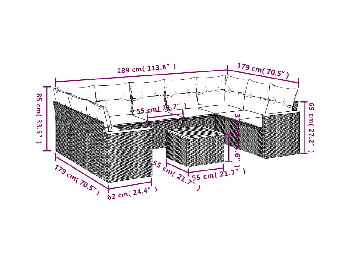 10 pcs conjunto sofás de jardim c/ almofadões vime PE preto