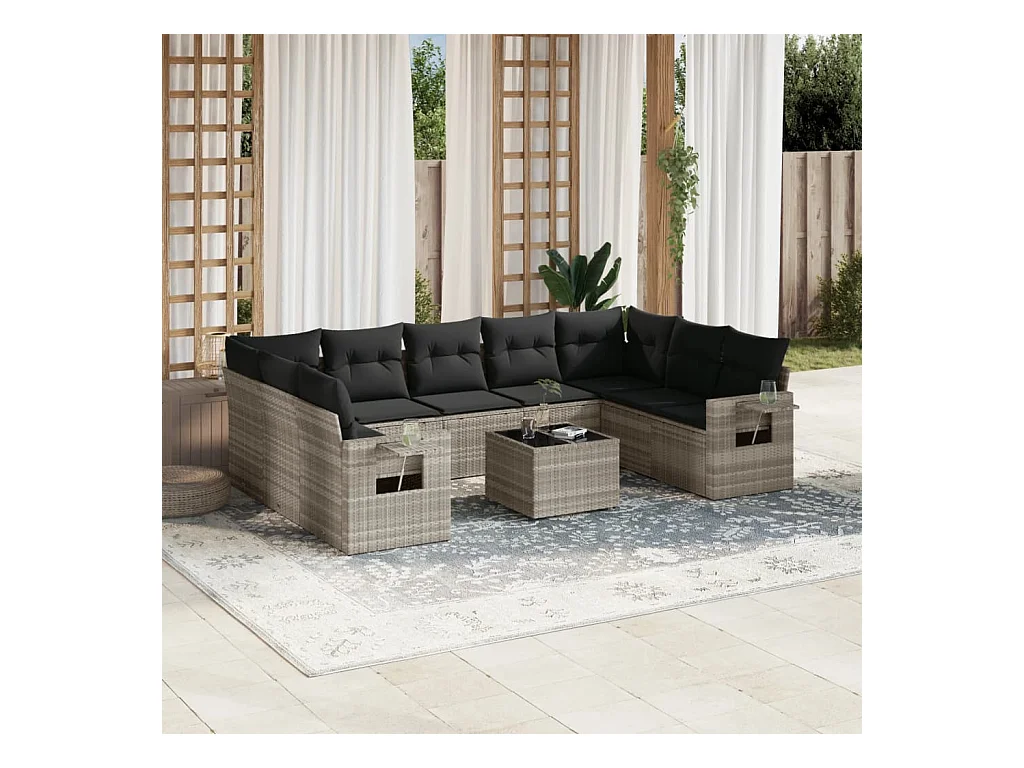 10 peças conj. sofás jardim com almofadões vime PE cinzento-claro