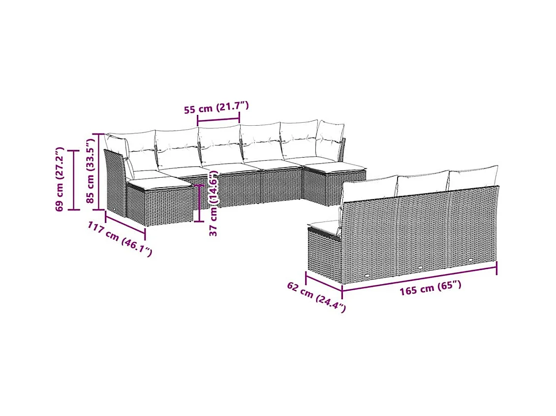 10 peças conj. sofás jardim com almofadões vime PE cinzento-claro