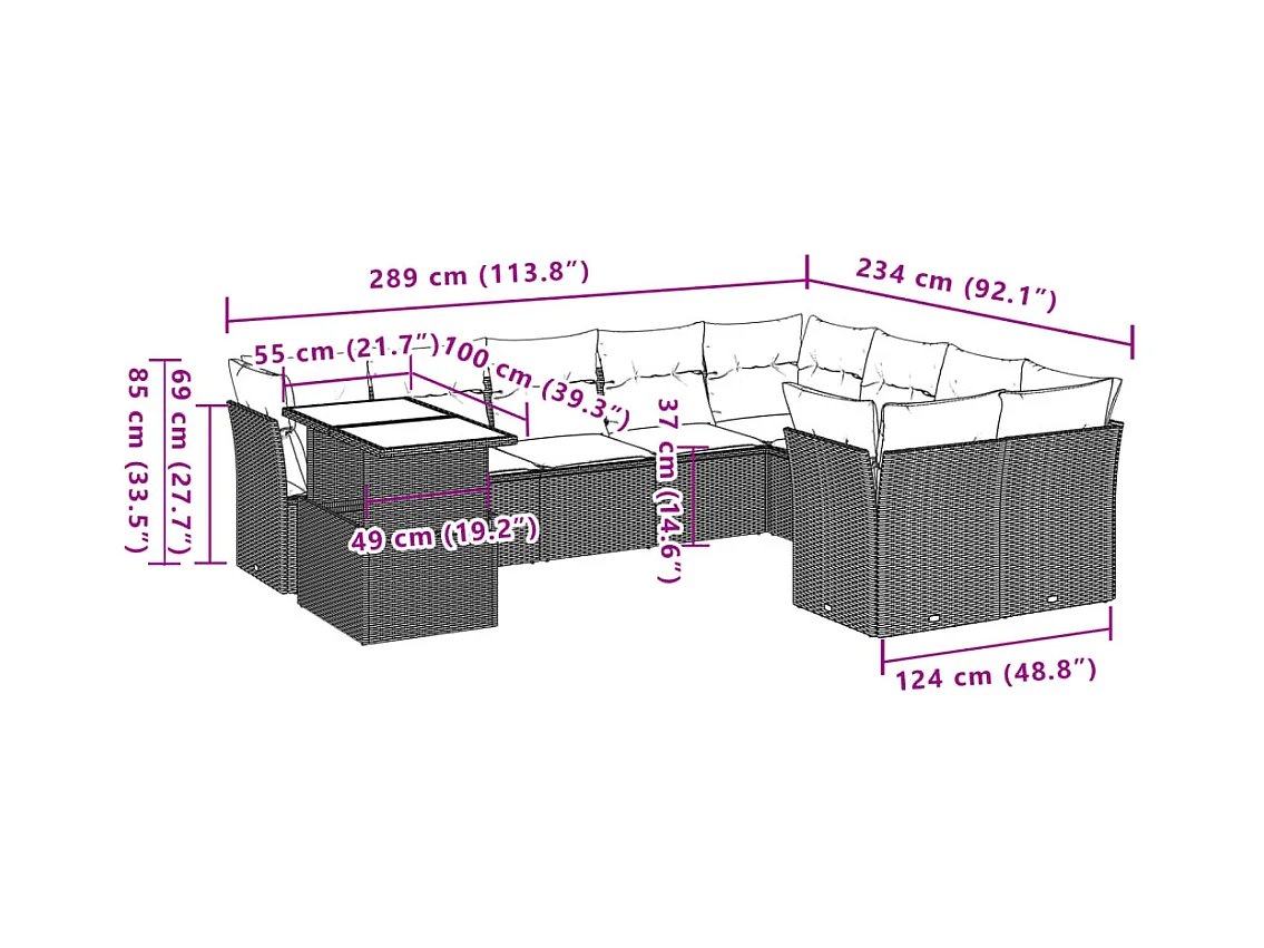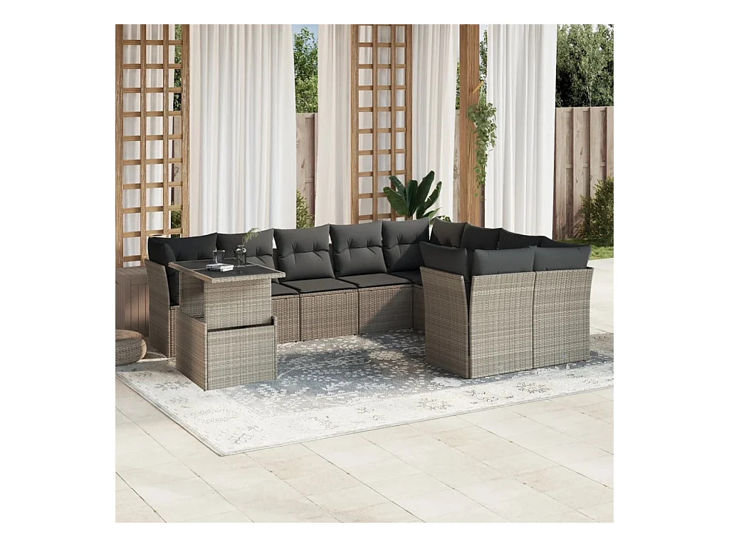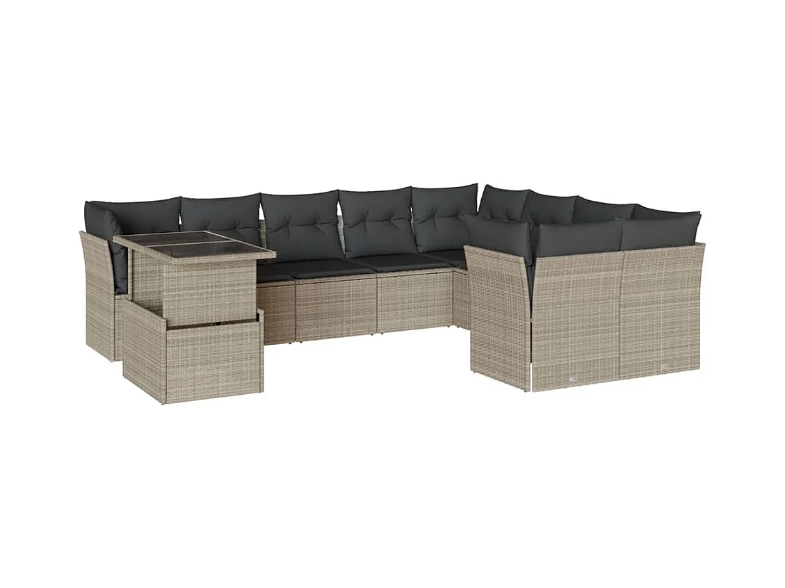 10 peças conj. sofás jardim com almofadões vime PE cinzento-claro