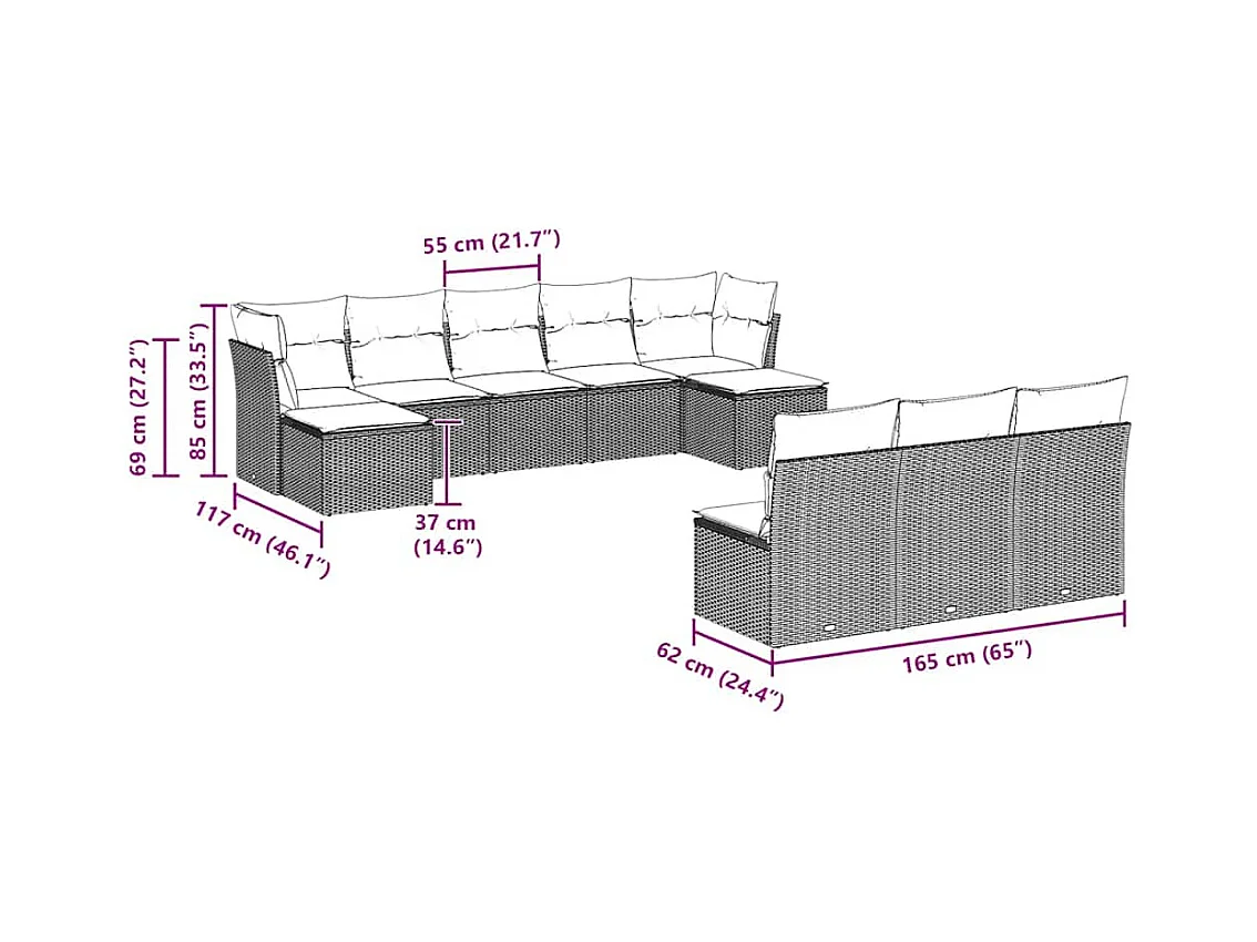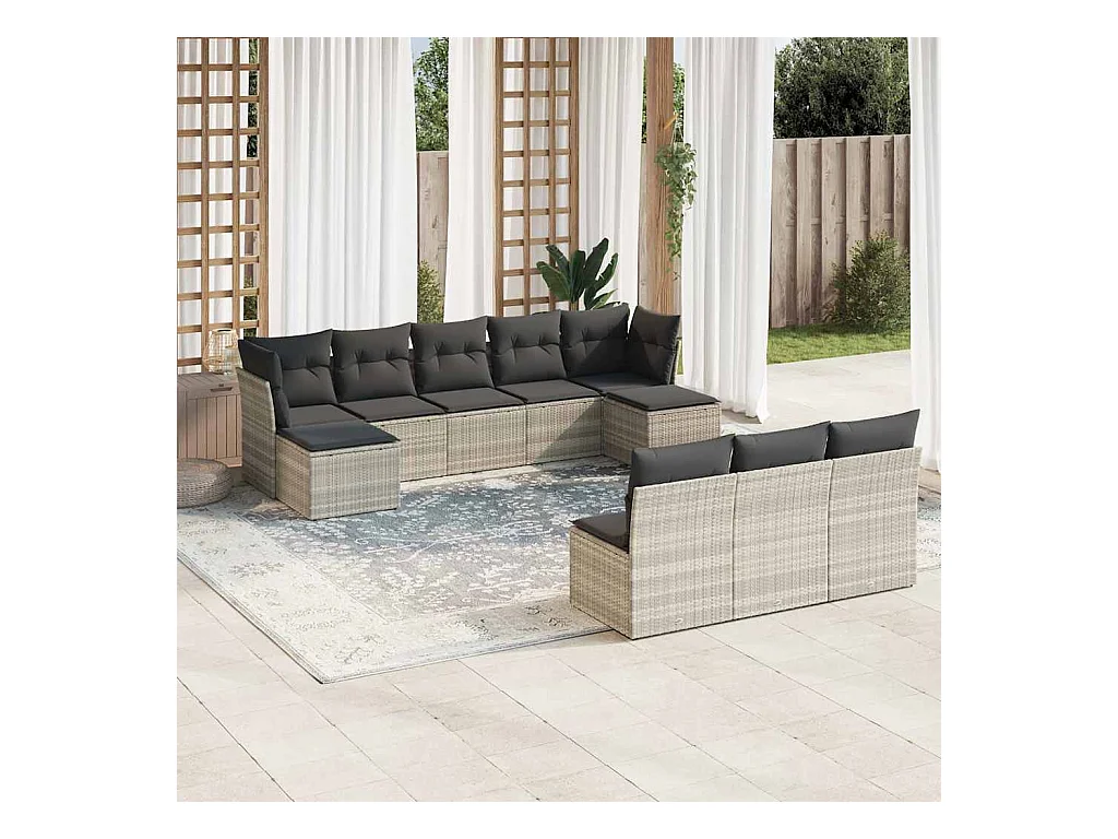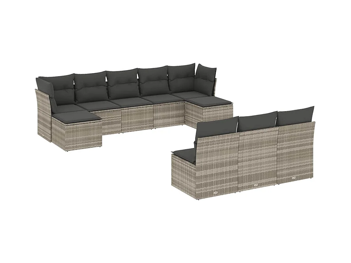 10 peças conj. sofás jardim com almofadões vime PE cinzento-claro