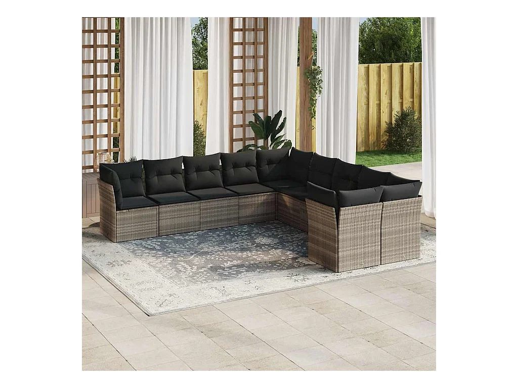10 peças conj. sofás jardim com almofadões vime PE cinzento-claro