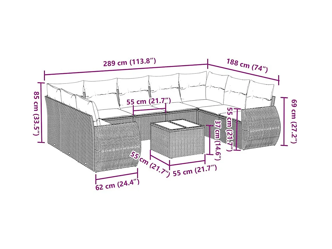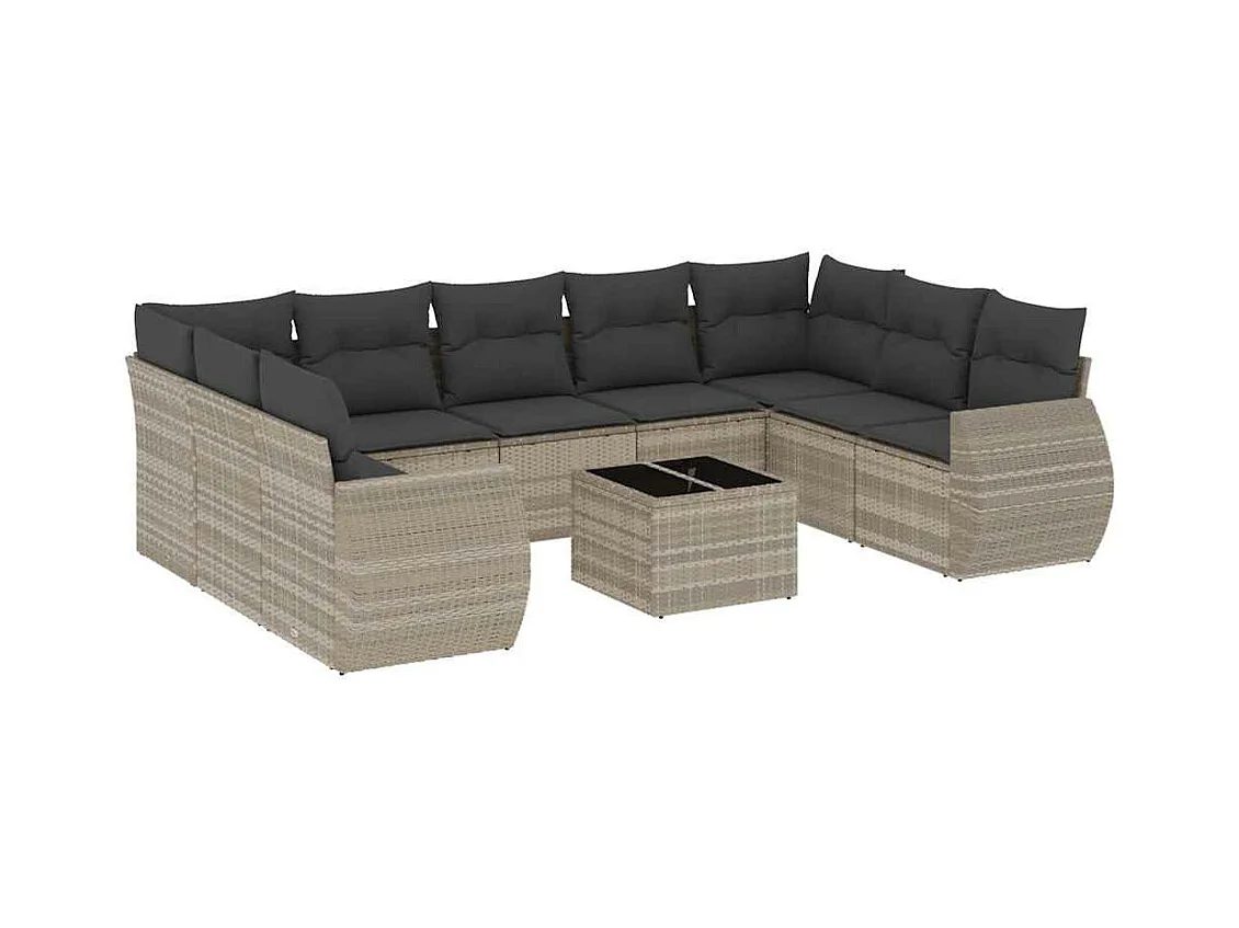 10 peças conj. sofás jardim com almofadões vime PE cinzento-claro