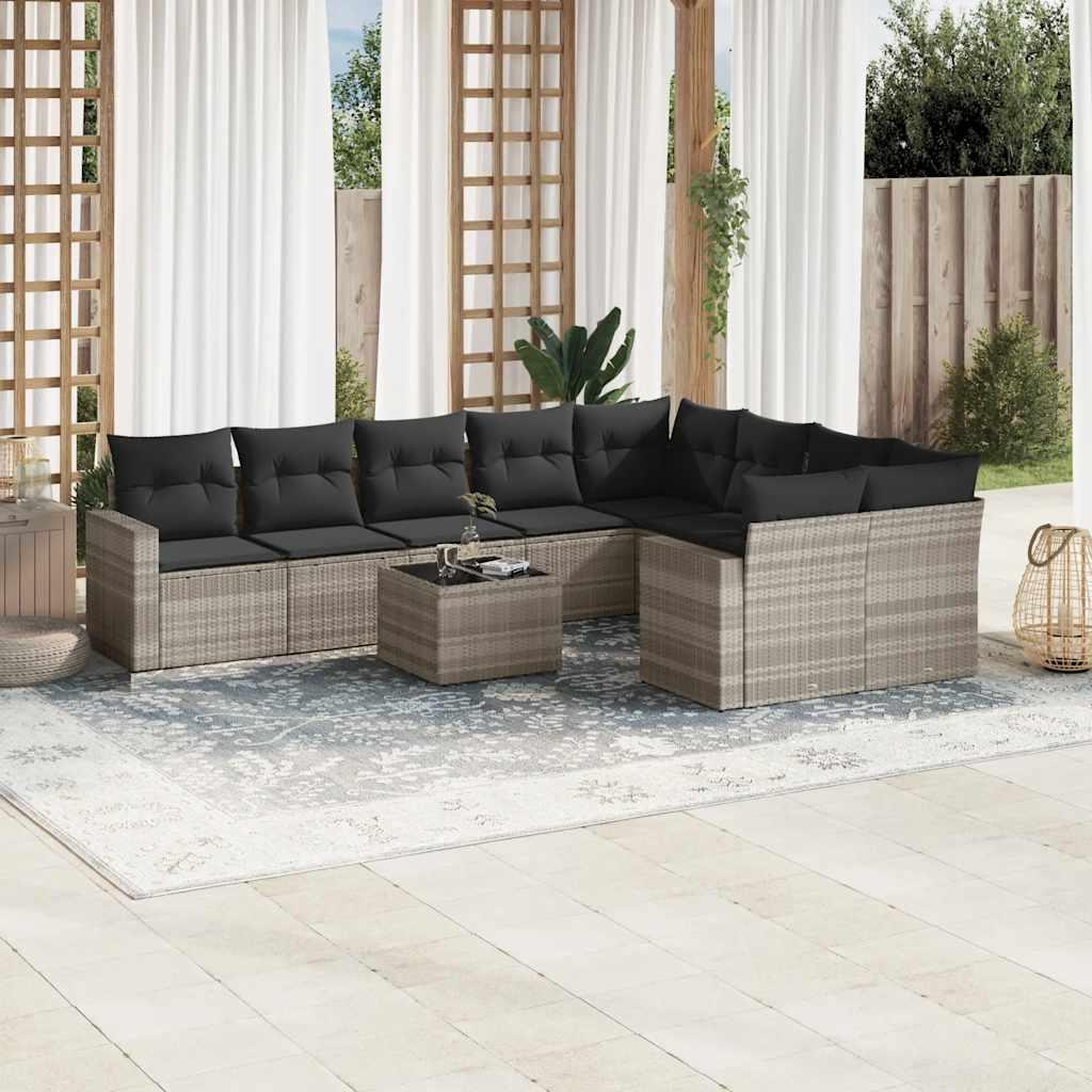 10 peças conj. sofás jardim com almofadões vime PE cinzento-claro
