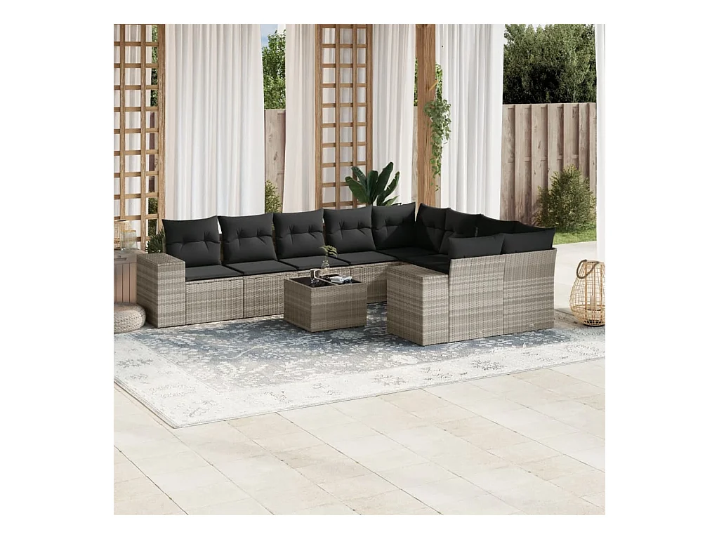 10 peças conjunto sofás de jardim com almofadões vime PE cinzento