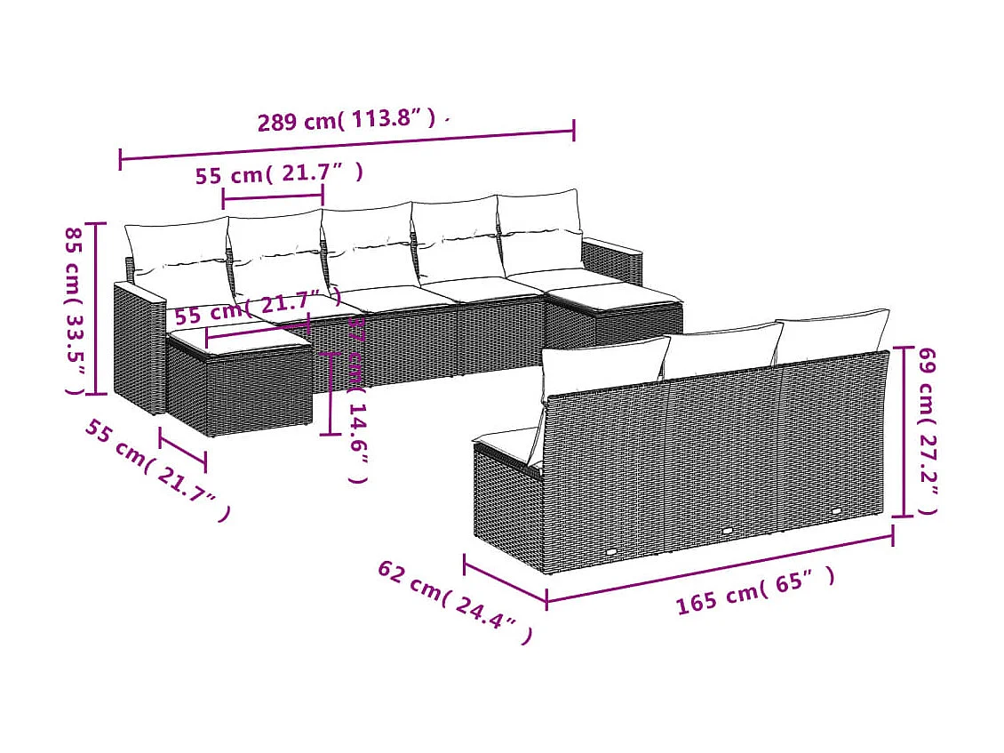 10 peças conjunto de sofás para jardim com almofadões vime PE bege