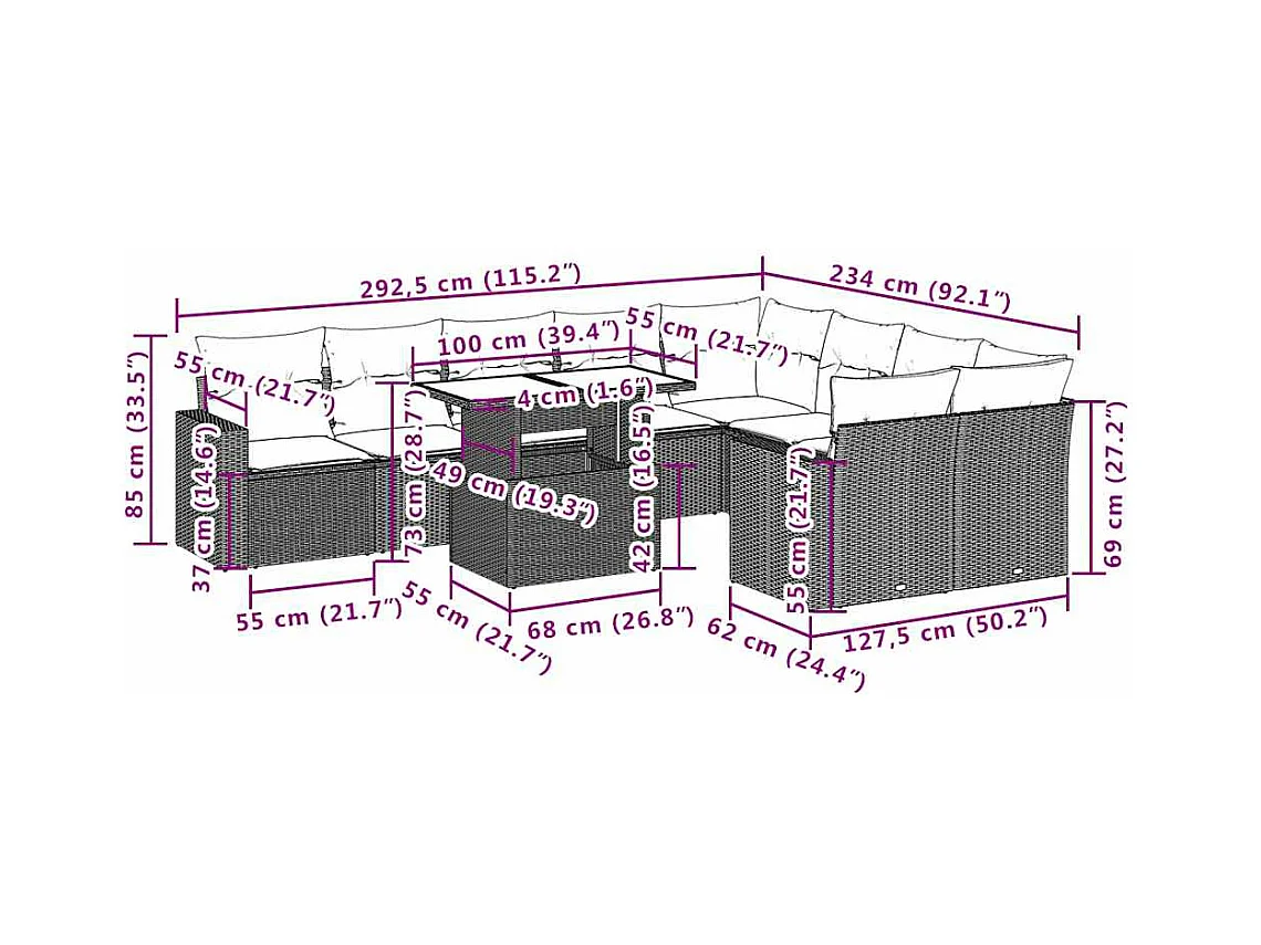11 peças conjunto sofás de jardim com almofadões vime PE bege