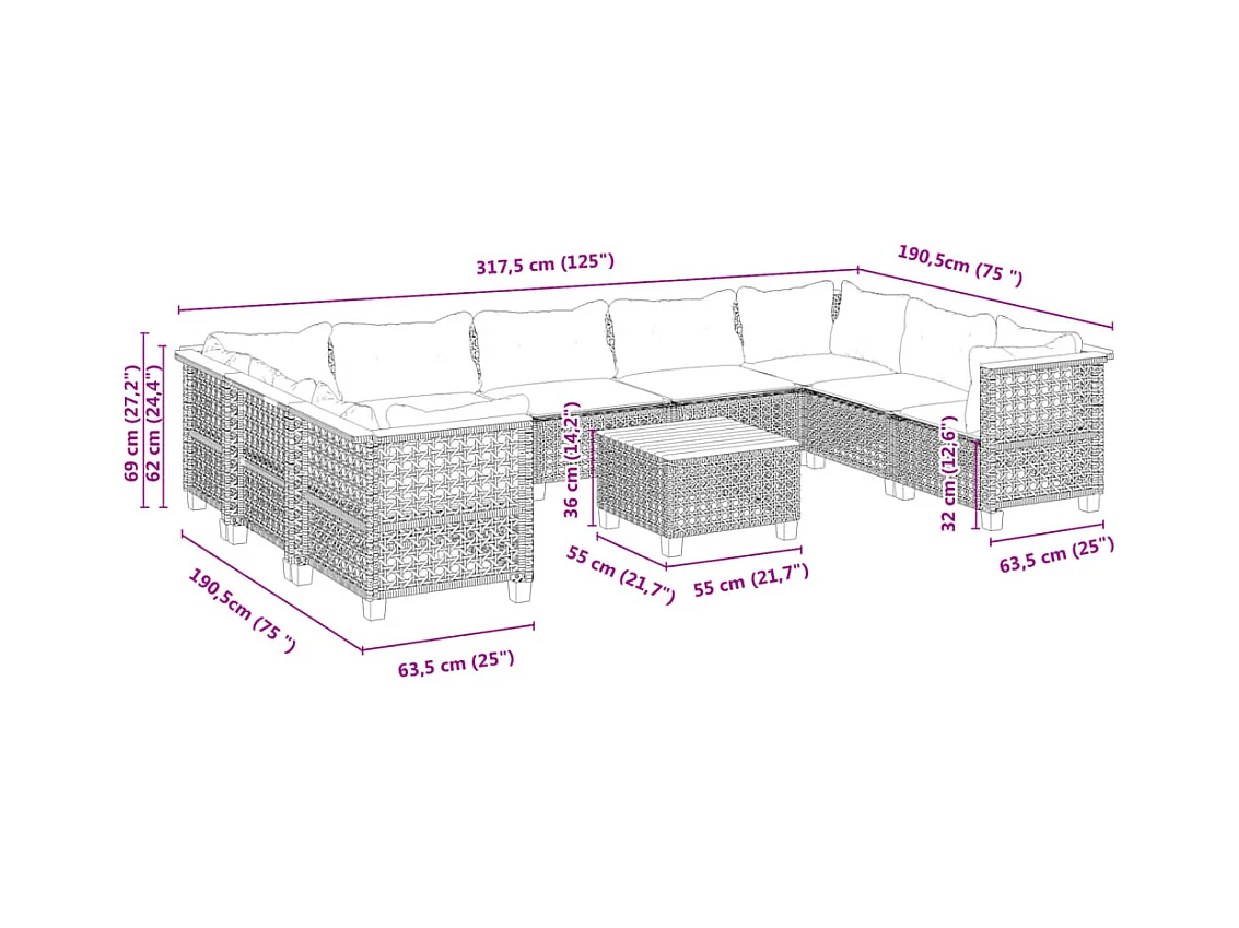 10 peças conj. sofás jardim com almofadões vime PE cinzento-claro