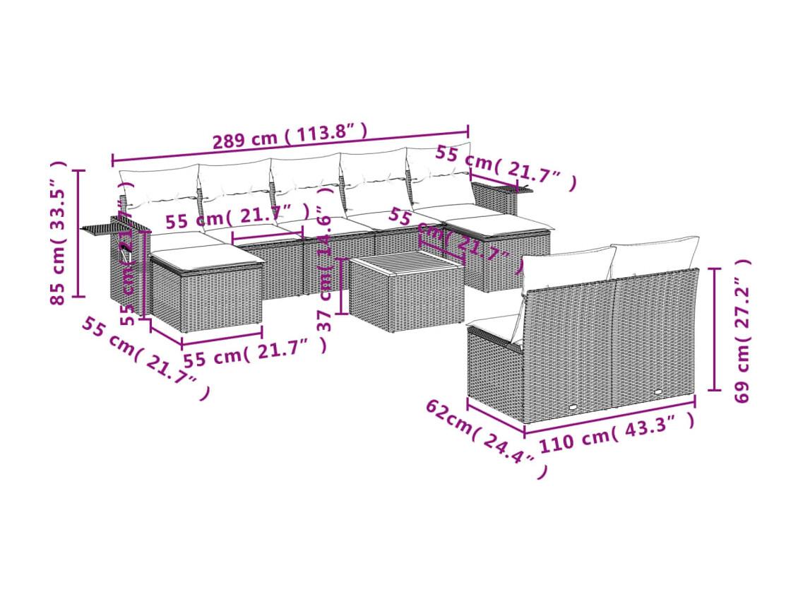 10 peças conjunto sofás jardim com almofadões vime PE/acácia preto