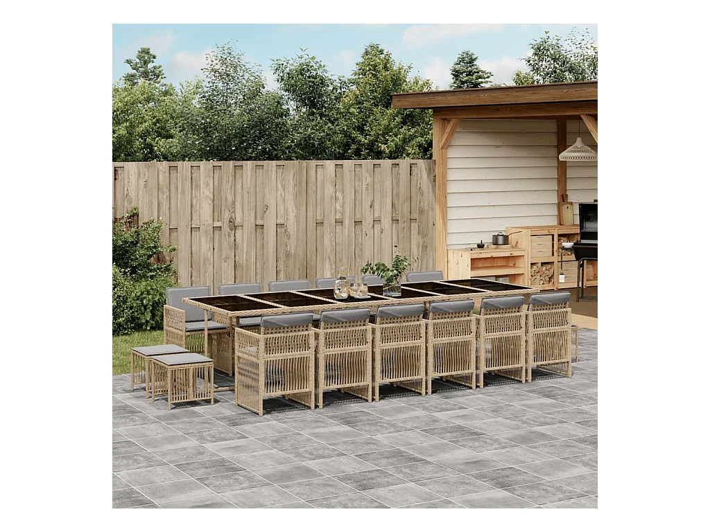 17 pcs conjunto de jantar p/ jardim c/ almofadões vime PE bege