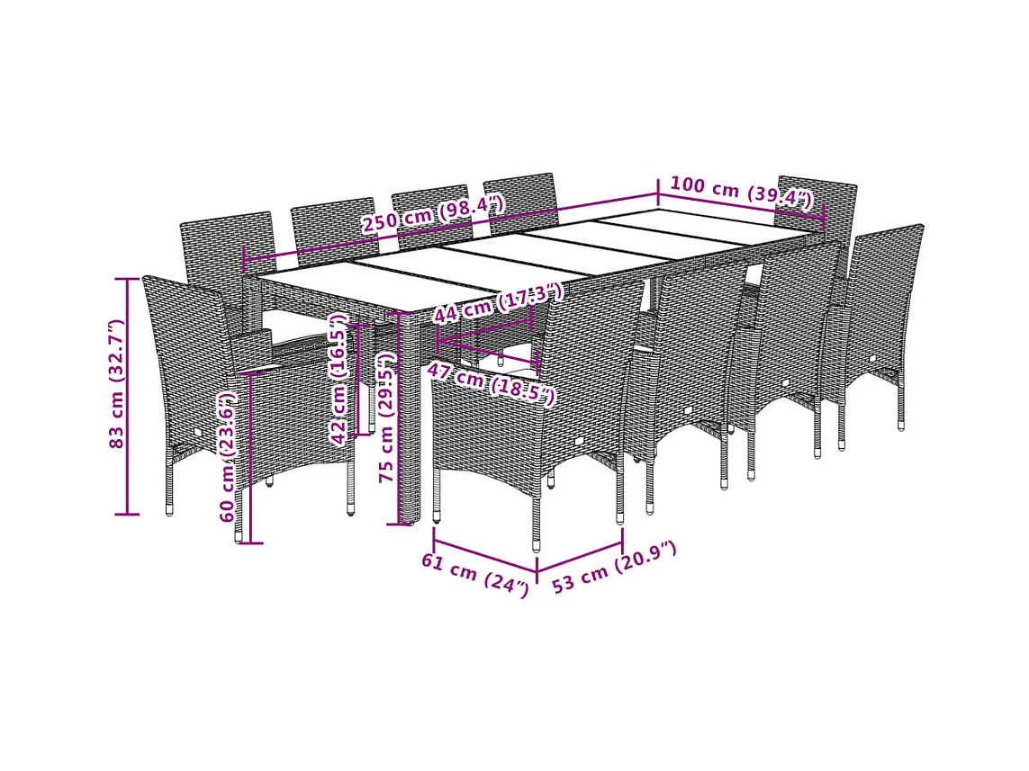 11 pcs conjunto jantar jardim com almofadões vime PE/vidro bege