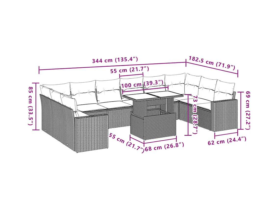 11 pcs conjunto sofás de jardim c/ almofadões vime PE bege