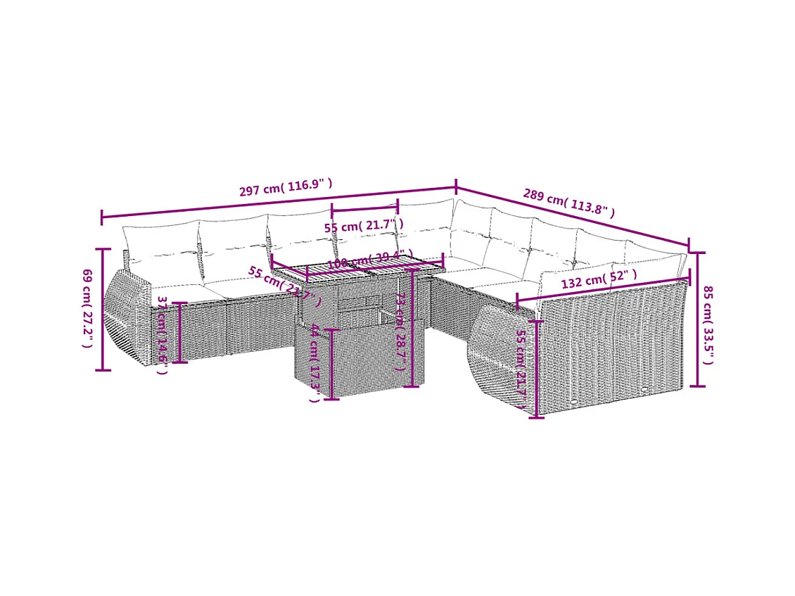 11 pcs conjunto sofás de jardim c/ almofadões vime PE bege