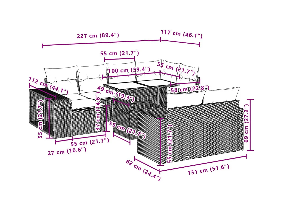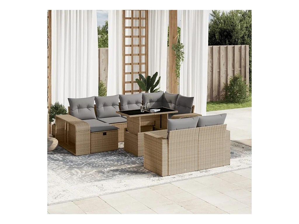11 pcs conjunto sofás de jardim c/ almofadões vime PE bege