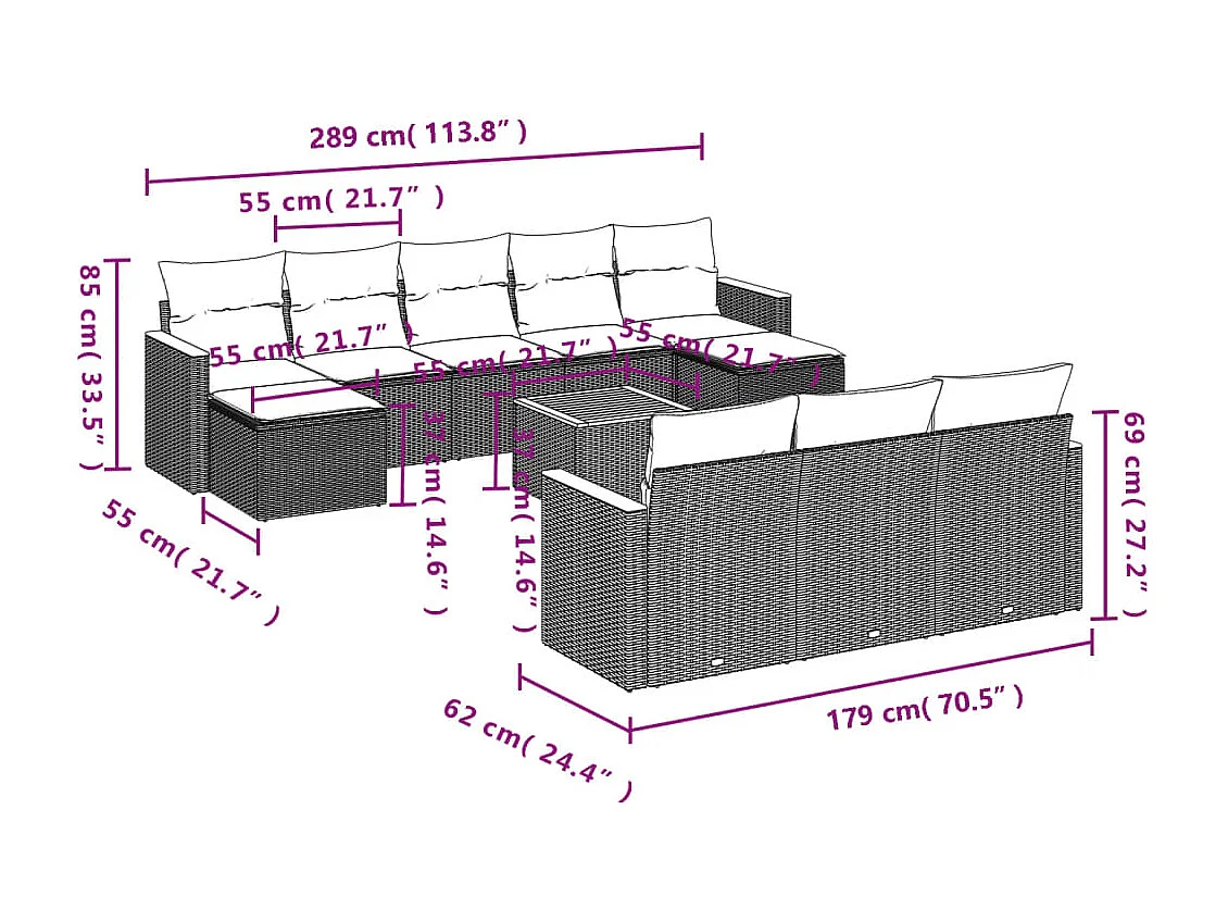 9 pcs conjunto de sofás p/ jardim c/ almofadões vime PE preto