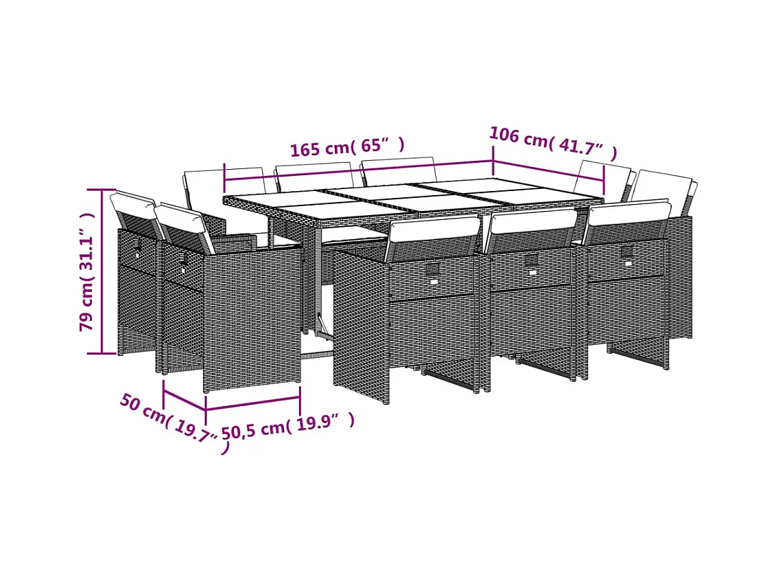 11 peças conj. jantar jardim com almofadões vime PE bege misturado
