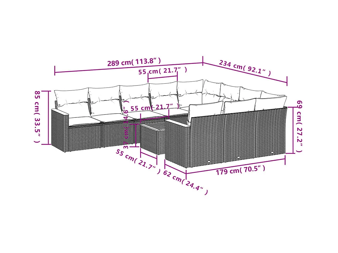 11 pcs conjunto sofás de jardim c/ almofadões vime PE bege