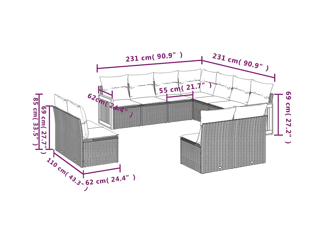 11 pcs conjunto sofás de jardim c/ almofadões vime PE bege