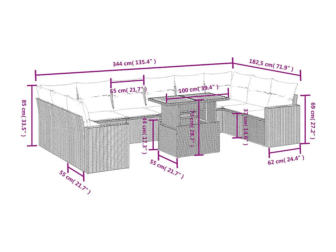 11 peças conjunto sofás de jardim com almofadões vime PE bege