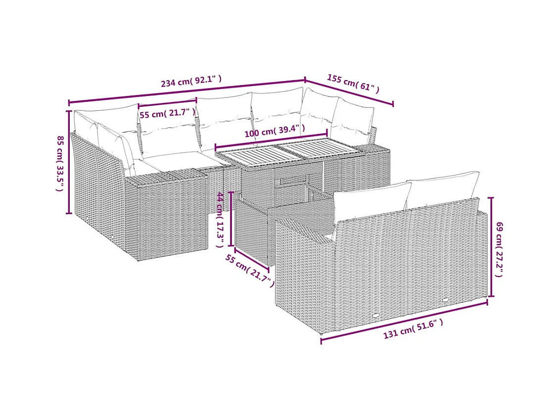 11 pcs conjunto sofás de jardim c/ almofadões vime PE bege