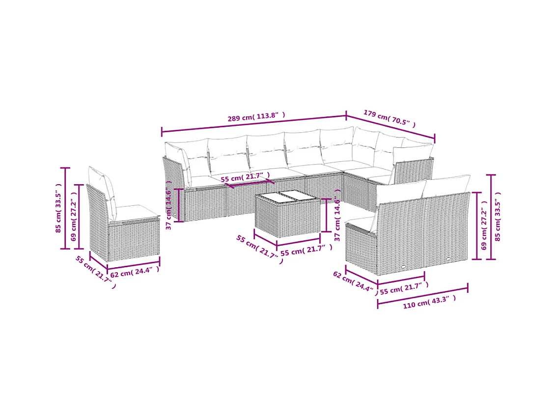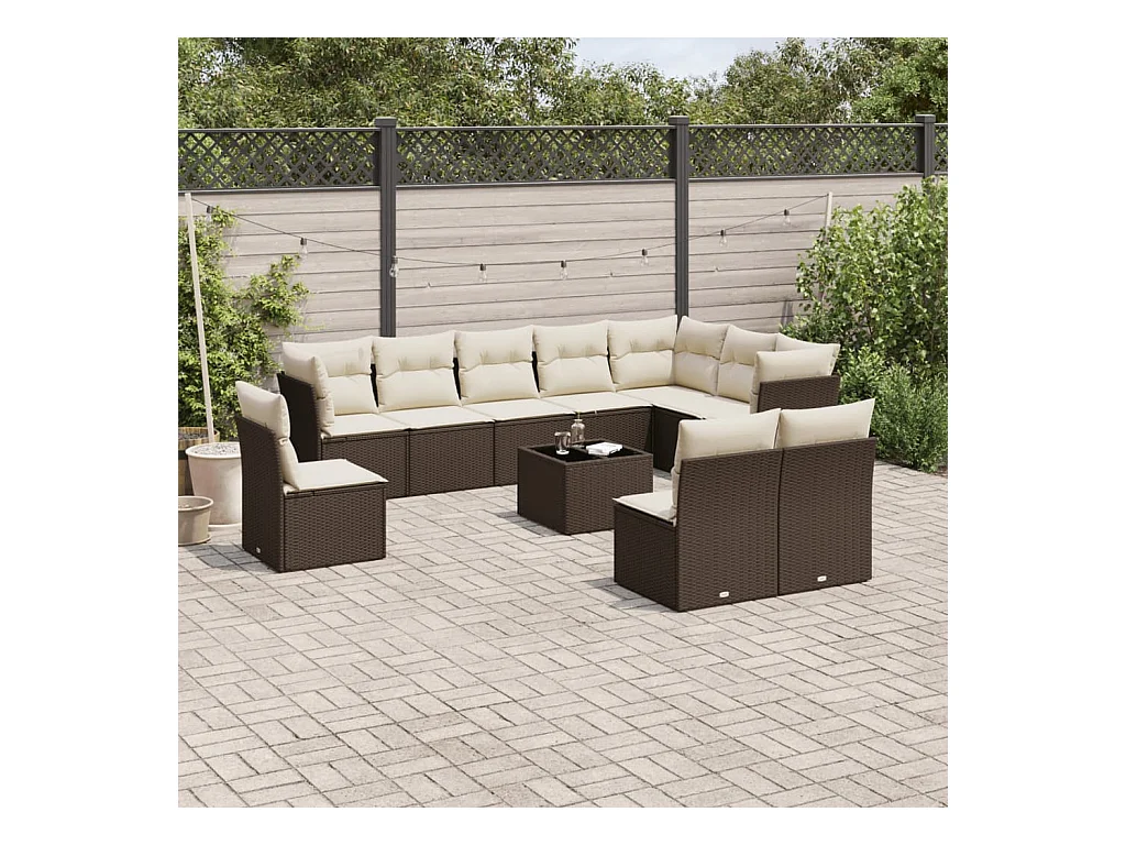 10 peças conj. sofás jardim com almofadões vime PE castanho