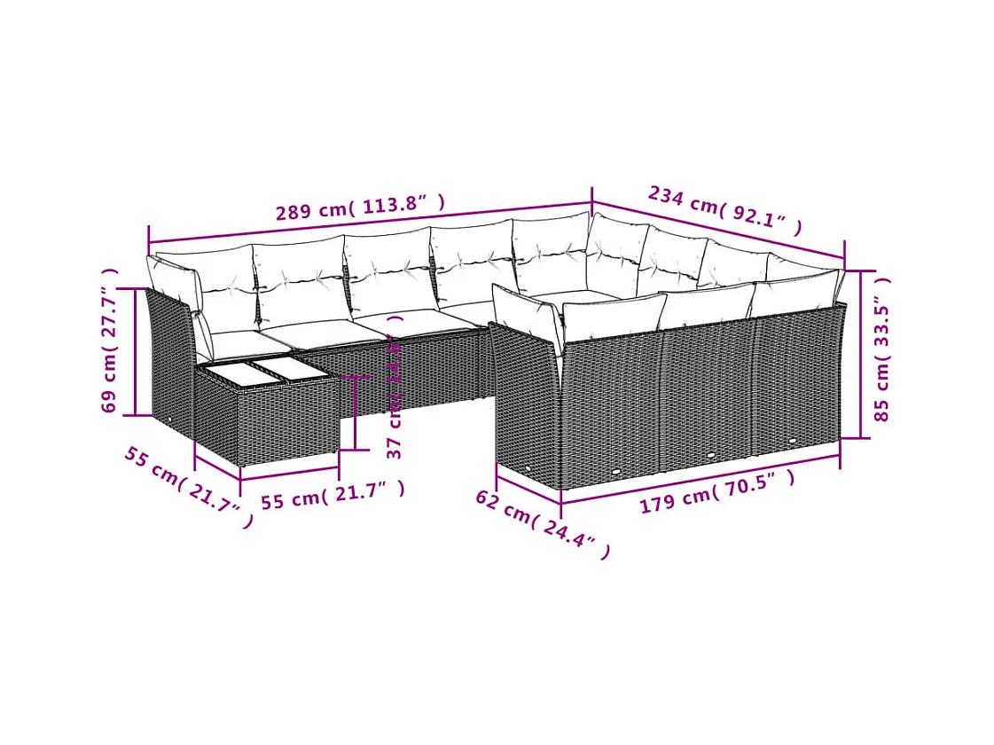 10 peças conj. sofás jardim com almofadões vime PE castanho