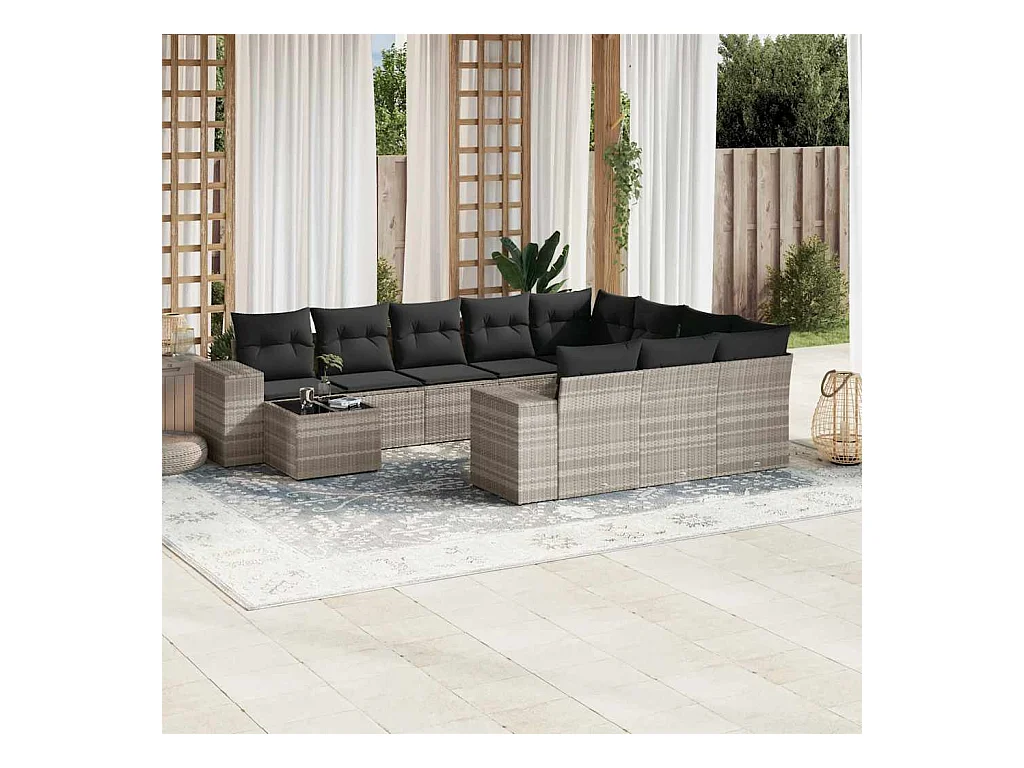 10 peças conj. sofás jardim com almofadões vime PE cinzento-claro