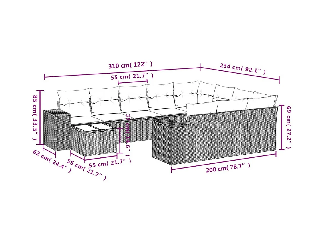 11 peças conjunto sofás de jardim com almofadões vime PE cinzento