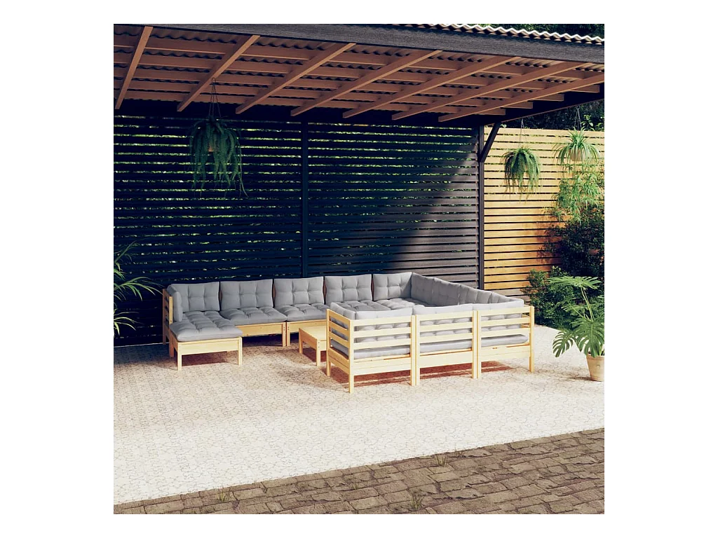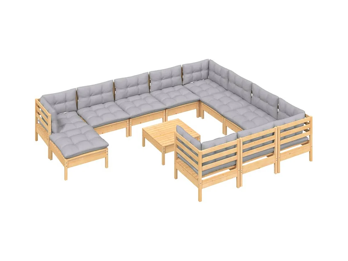 12peças conjunto lounge de jardim + almofadões cinza pinho maciço