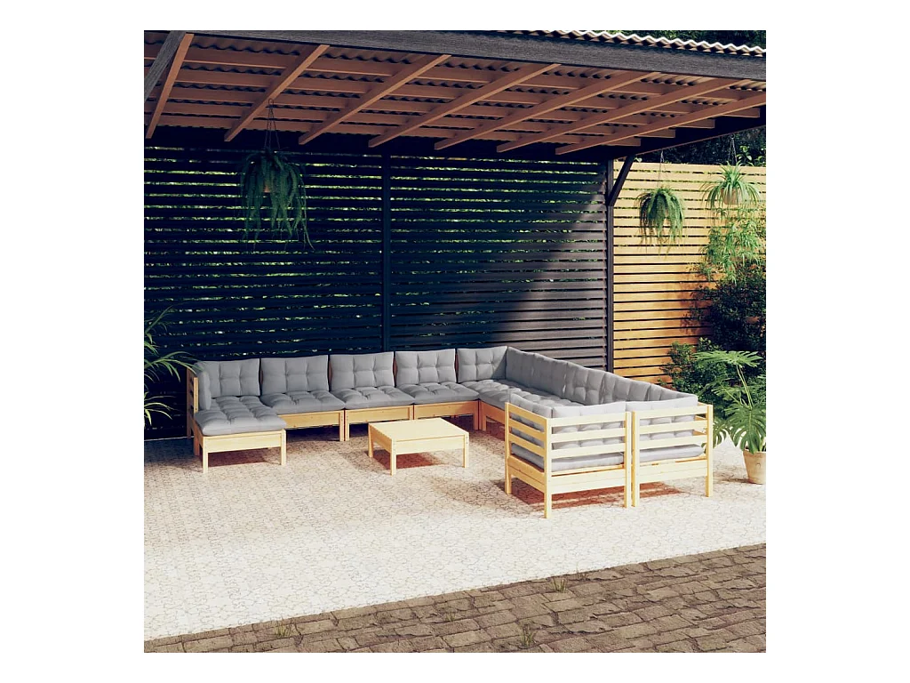 10 pcs conjunto lounge de jardim c/ almofadões cinzentos pinho