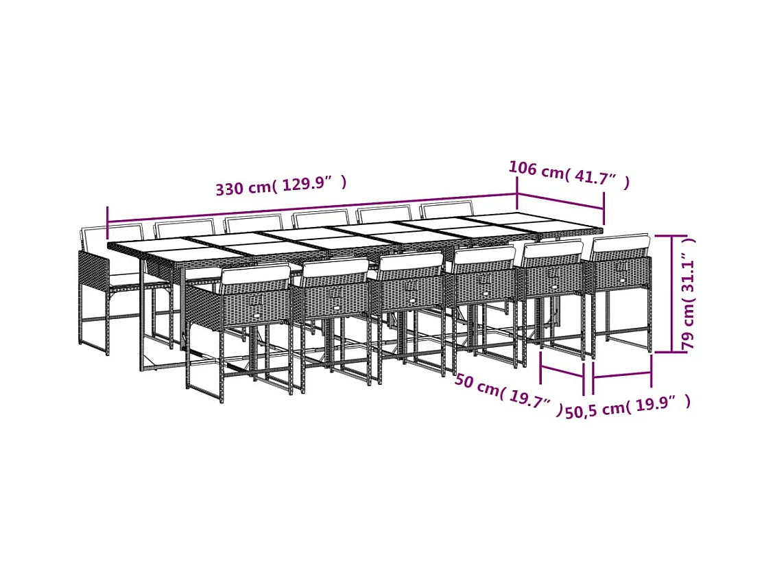 13 pcs conjunto jantar p/ jardim c/ almofadões vime PE cinzento