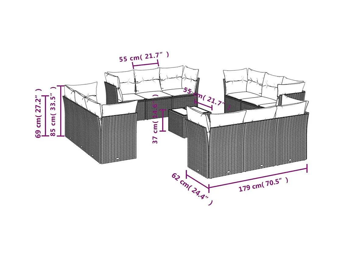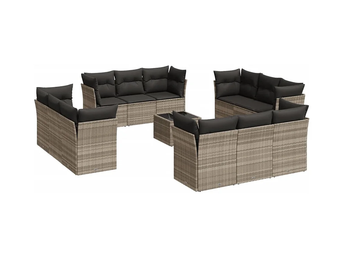 13 peças conj. sofás jardim com almofadões vime PE cinzento-claro