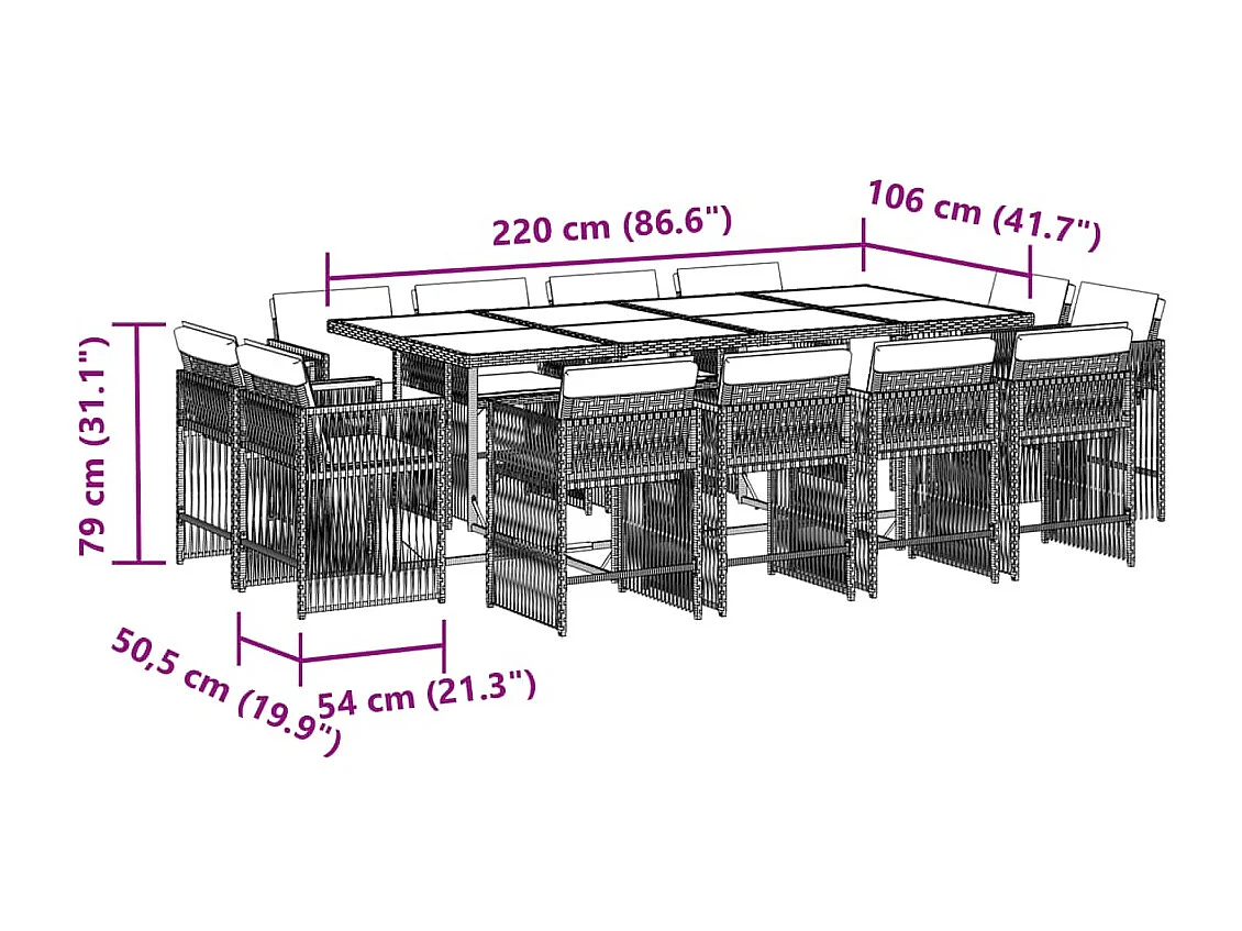 13 peças conj. jantar jardim com almofadões vime PE cinzento-claro