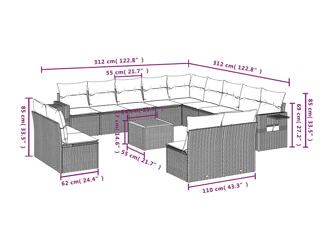 11 peças de móveis de jardim com almofadas de resina tecida preta