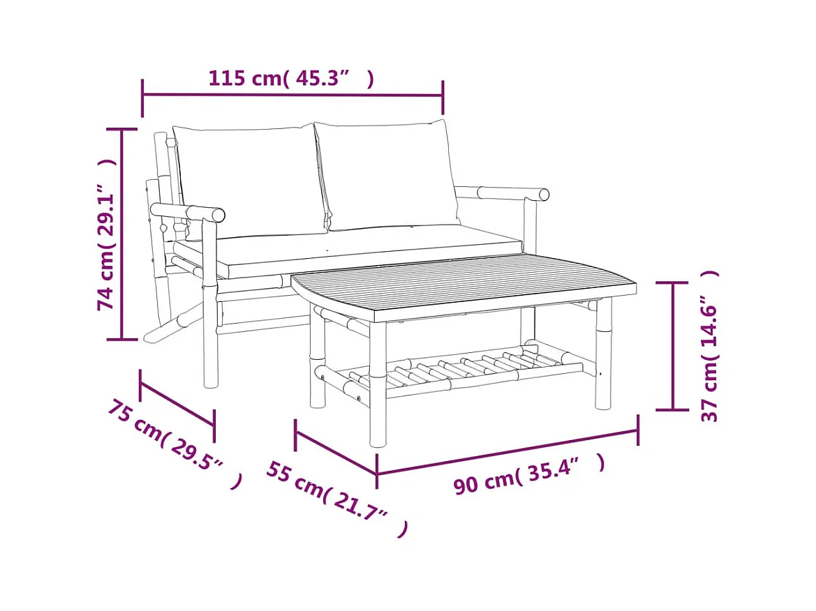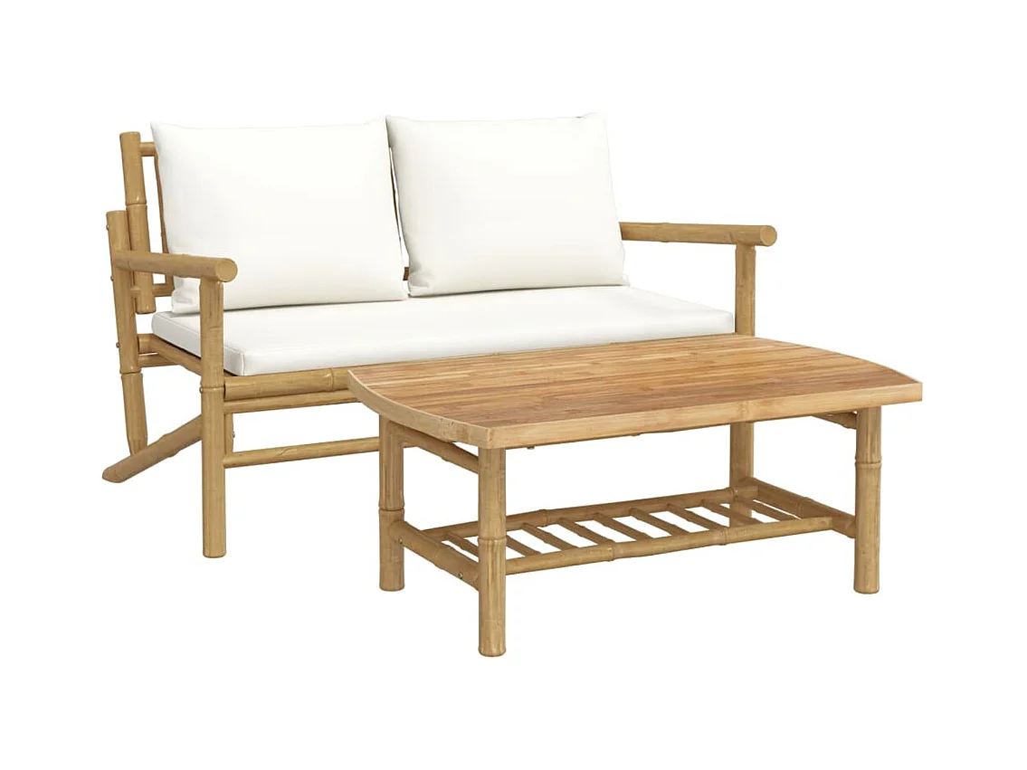 2 pcs conjunto lounge de jardim bambu c/ almofadões branco nata