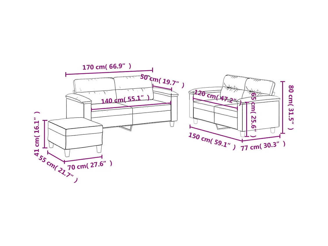 3 pcs conj. sofás c/ almofadões tecido de microfibra cor creme