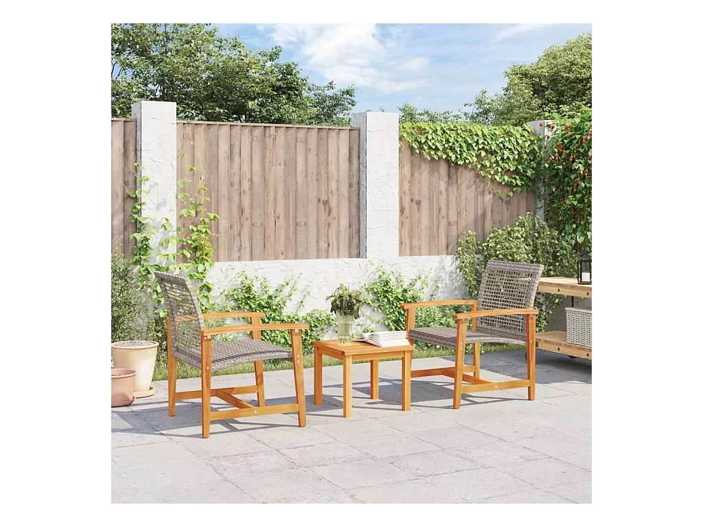3 pcs conjunto de bistrô vime PE e madeira de acácia cinzento PT579290