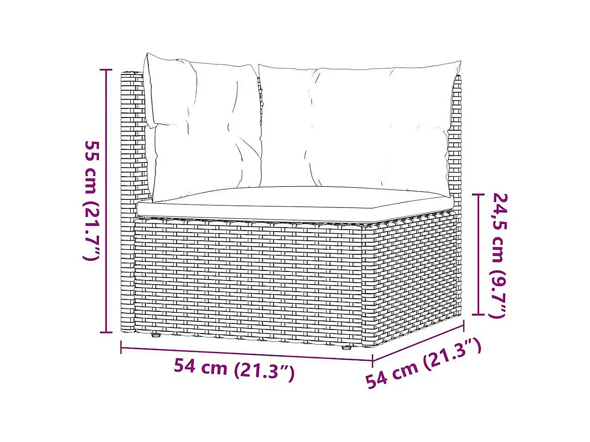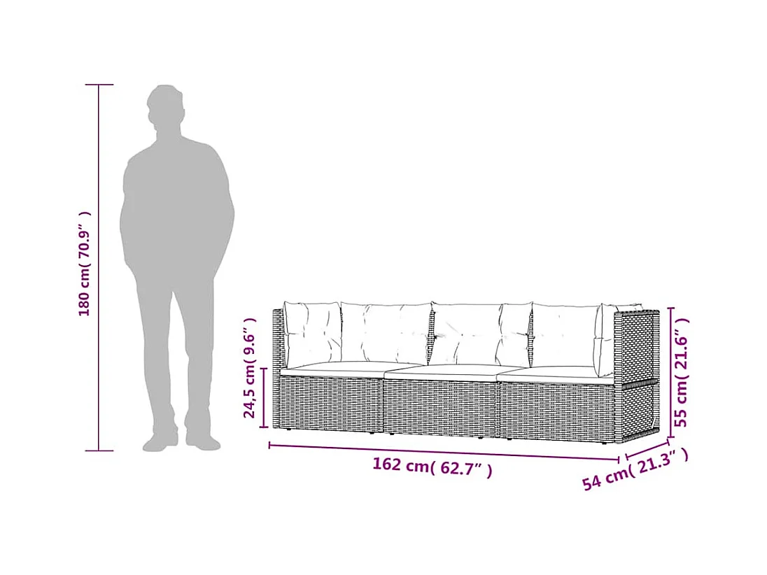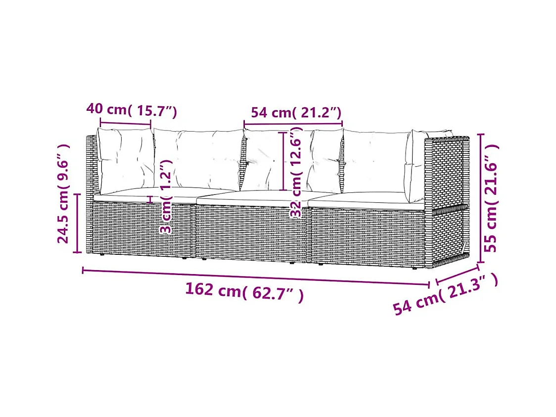 3 pcs conjunto lounge de jardim c/ almofadões vime PE cinzento