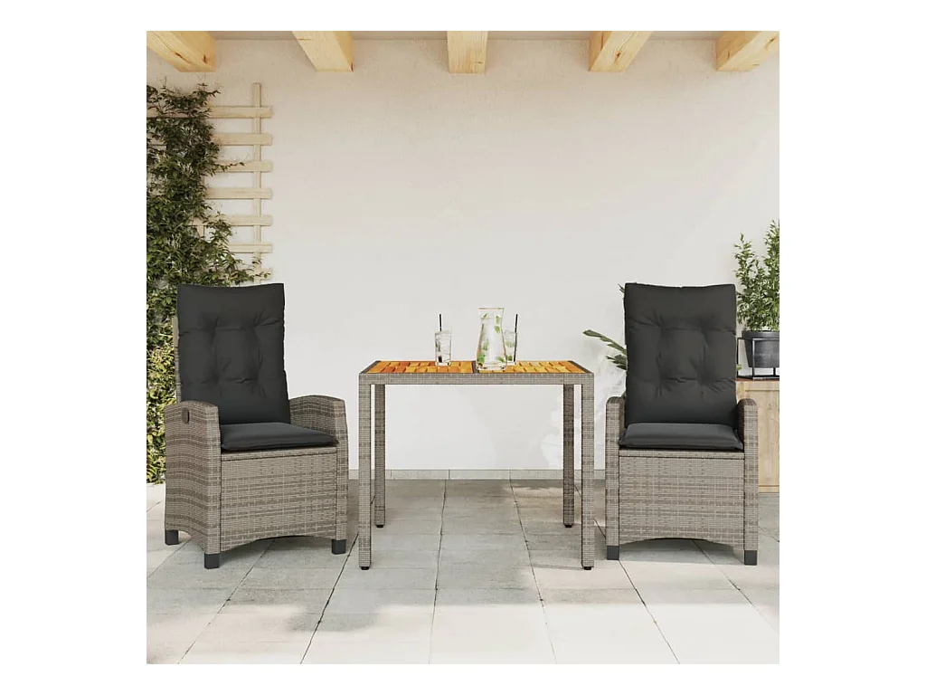 3 peças conjunto jantar jardim com almofadões vime PE/acácia cinza