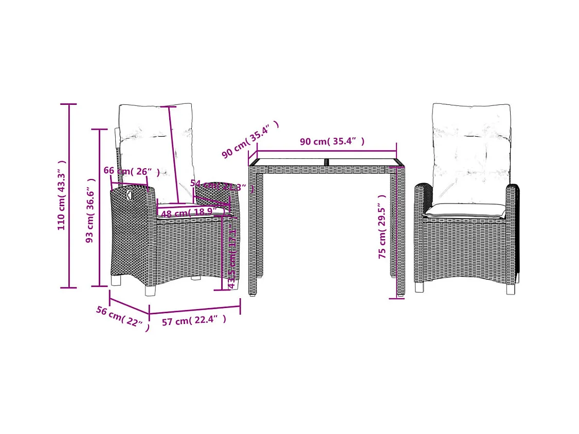 3 peças conjunto jantar jardim com almofadões vime PE/vidro cinza