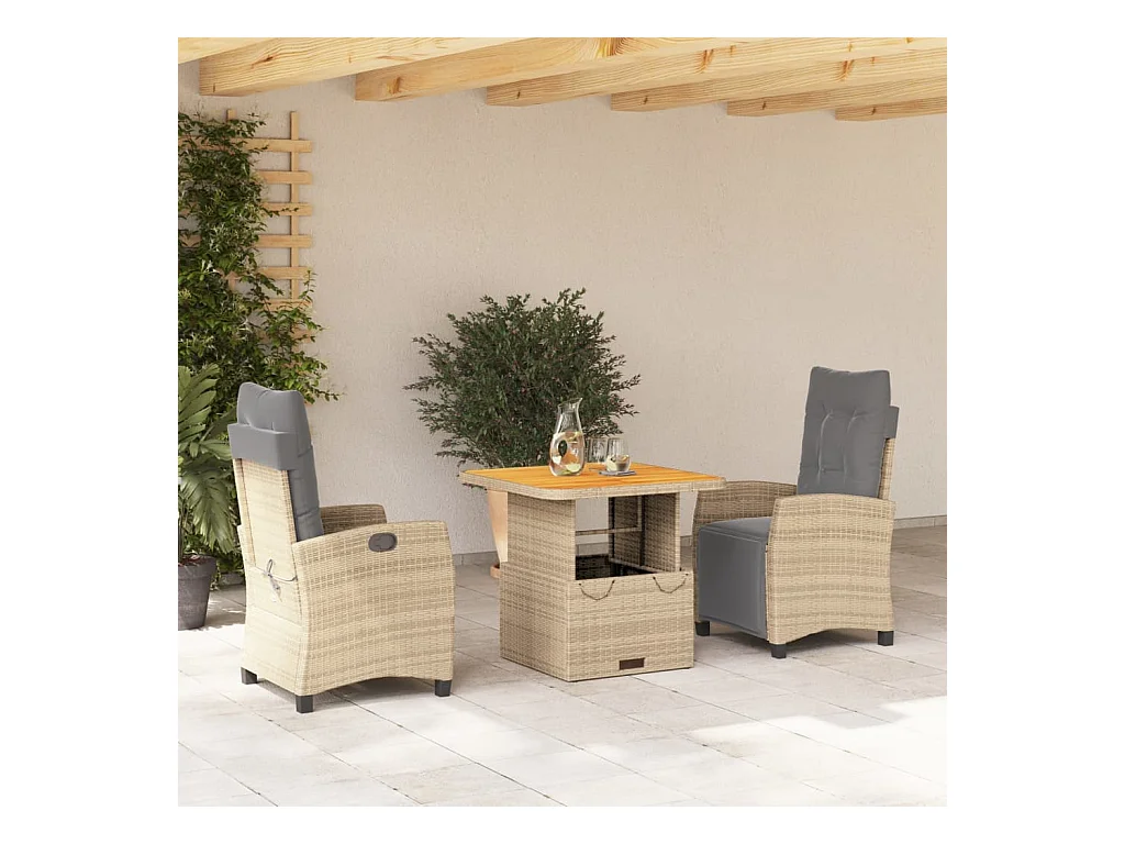 3 peças conjunto jantar jardim com almofadões vime PE/acácia bege