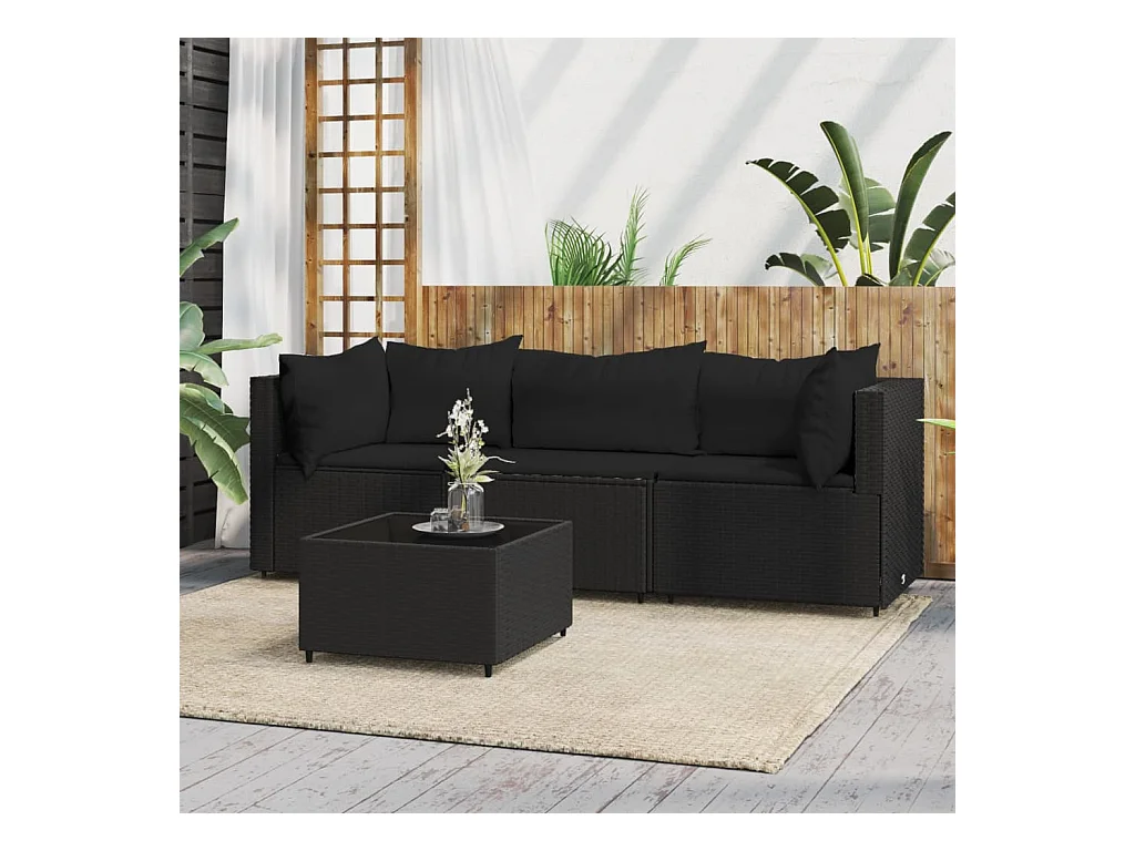 4 pcs conjunto lounge de jardim c/ almofadões vime PE preto PT752779