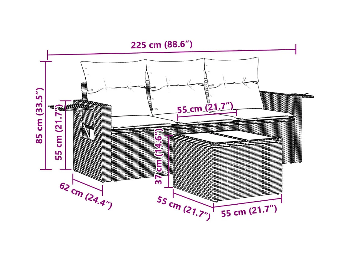 4 peças conj. sofás jardim com almofadões vime PE cinzento-claro
