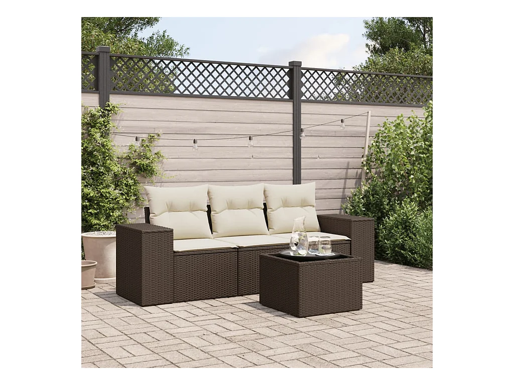 4 peças conjunto lounge jardim c/ almofadões vime PE castanho