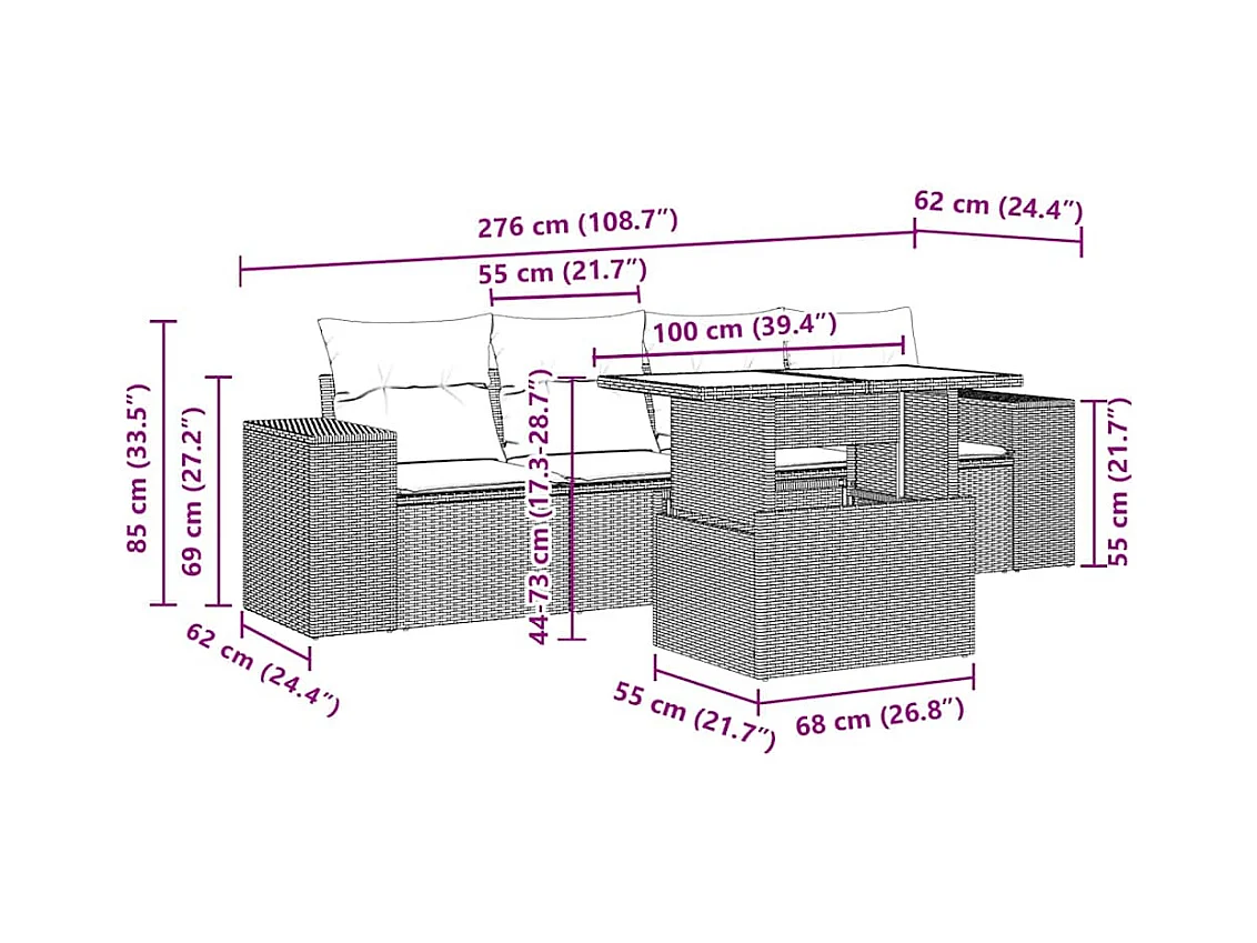5 pcs conj. sofás jardim c/ almofadões vime PE cinzento-claro
