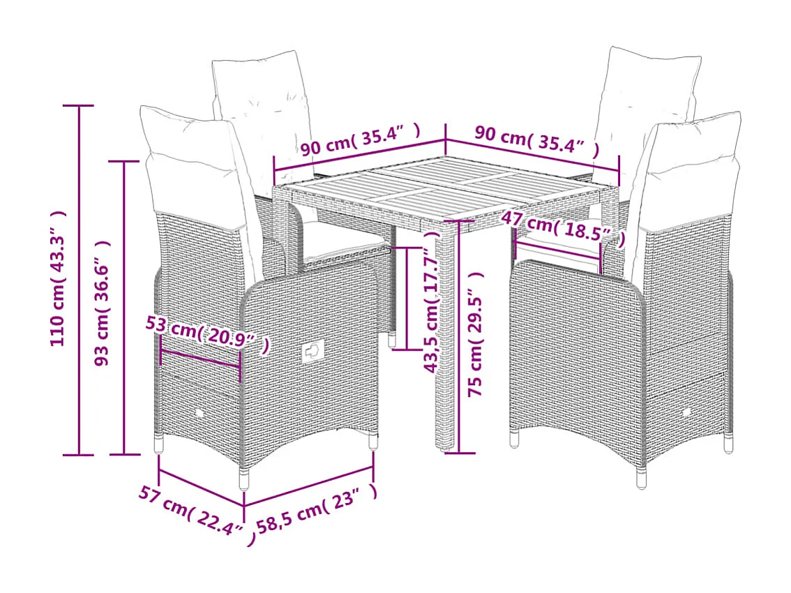 5 pcs conjunto bistrô de jardim c/ almofadões vime PE cinza